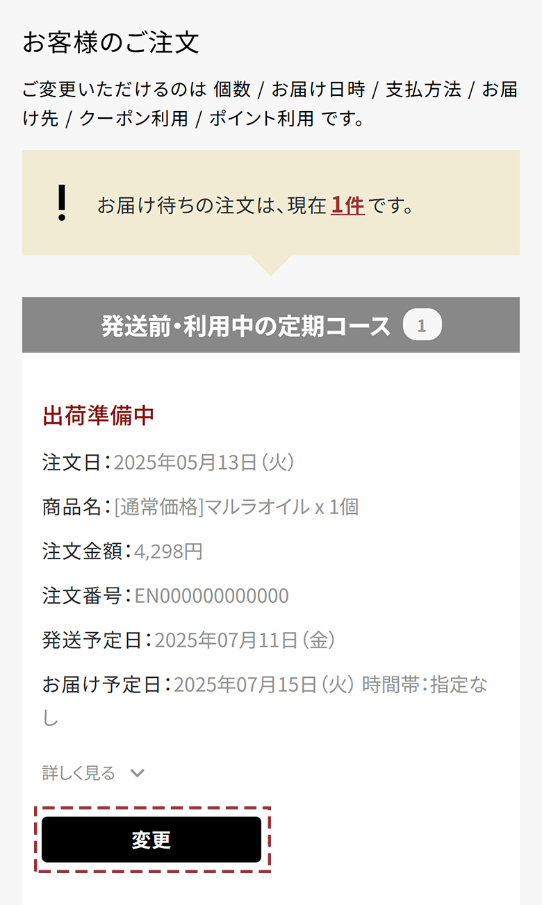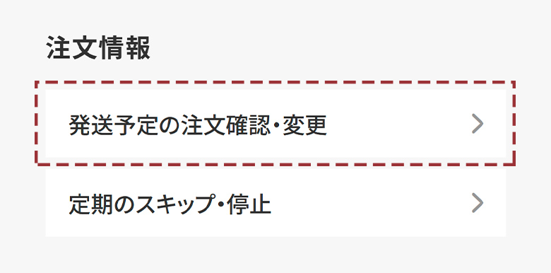 ①マイページの注文情報「発送予定の注文確認・変更」をクリック。