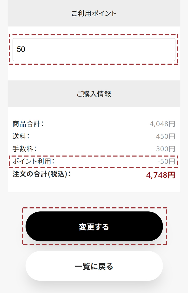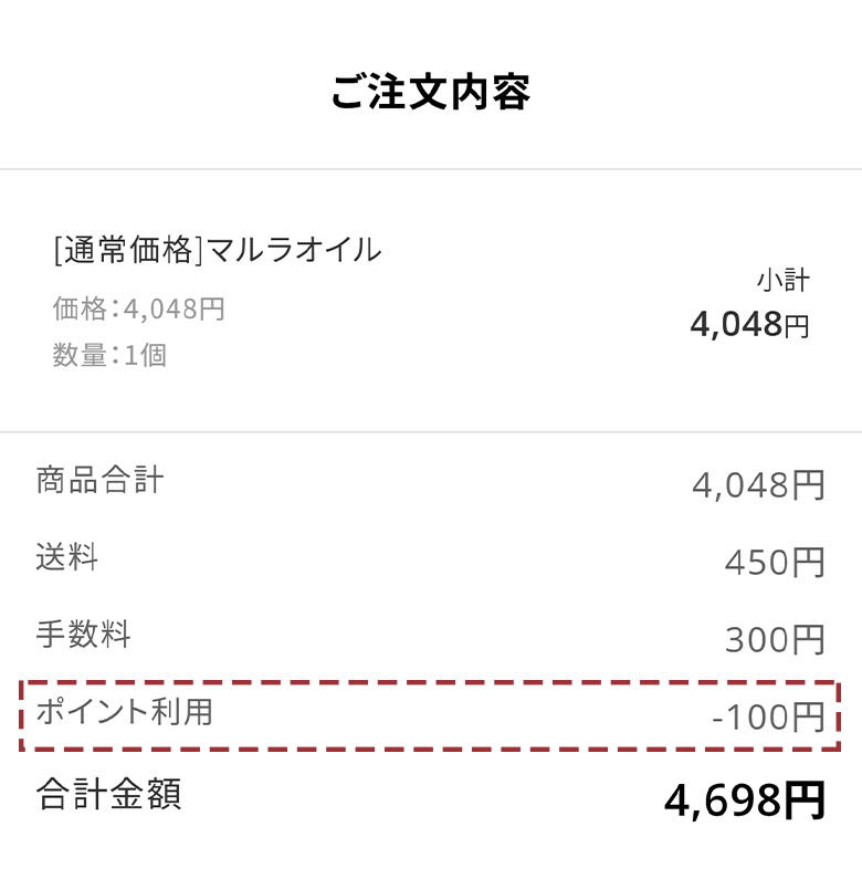 ご購入情報のポイント利用の欄にが適応されているか確認。