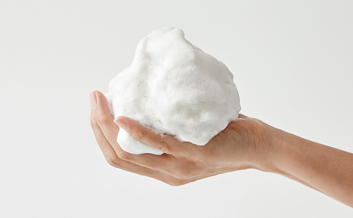 ぬるま湯でしっかり予洗いをします。 適量(2~3cm)を手にとり、水またはぬるま湯を少しずつ足しながら、手のひらでよく泡立てます。 (泡立てネットを使用するとさらに早く泡立ちます。) こすらずに肌をやさしくなでるように洗い、その後ぬるま湯で十分に洗い流します。