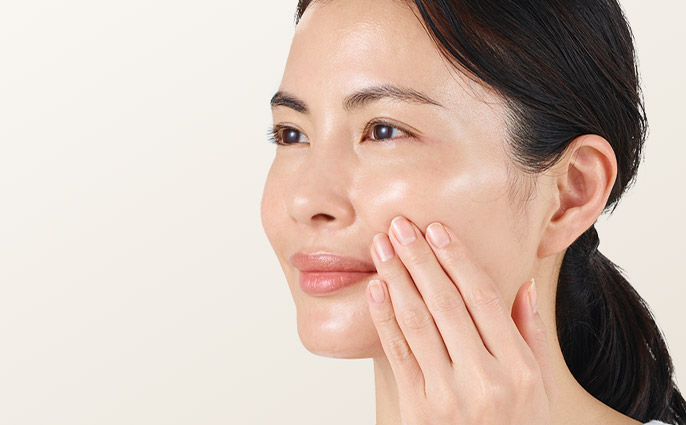 化粧水等で肌を整えた後、適量(さくらんぼ一粒大)を手にとり、手で顔を包み込むようになじませてください。
