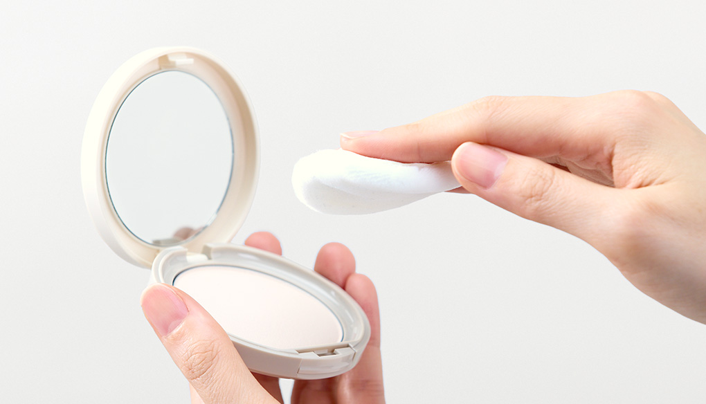 パフでパウダーをなでるようにとり、手の甲で粉の量を調整し、軽く滑らせるように肌に塗ります。